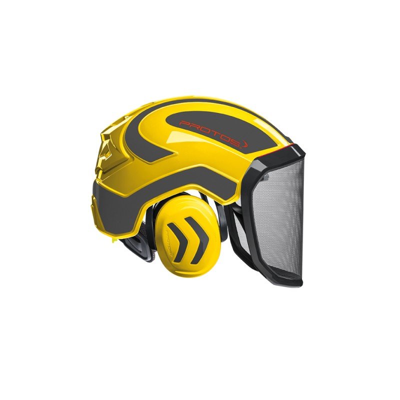 Découvrez le casque de protection intégral forestier Protos, idéal pour les travaux de tronçonnage, élagage et débroussaillage. Conçu pour assurer une sécurité optimale, ce casque complet est équipé d'une visière F39, offrant une protection maximale contre les débris volants et les chocs. Avec son design jaune et gris, il allie visibilité et robustesse, parfait pour les professionnels et les particuliers. Compatible avec une large gamme de machines de motoculture, ce casque est un équipement essentiel pour toute intervention en milieu forestier. Choisissez la qualité et la sécurité avec le HOVE-204002.