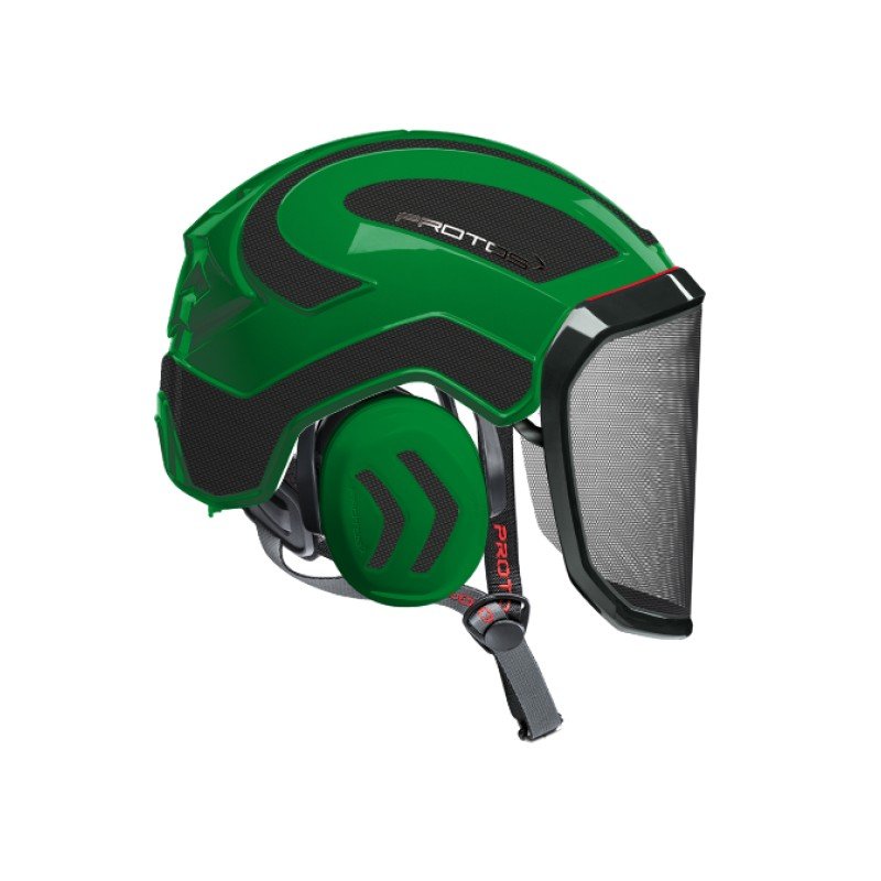 Casque de protection intégral pour arboriste, troncconnage et élagage, conçu pour fournir une protection maximale contre les chutes de branches et les éclats de bois. Ce casque de haute qualité est disponible en deux coloris vert et gris carbone, offrant une visibilité optimale dans les environnements de travail. Protégé contre les impacts et les chocs, ce casque répond aux normes de sécurité les plus élevées pour les professionnels de l'arboriculture.